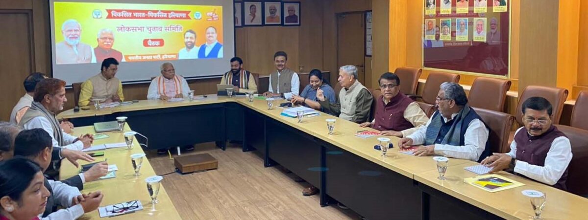 बैठक में लोकसभा चुनावों, आगामी कार्य योजनाओं और संगठनात्मक विषयों पर चर्चा मुख्यमंत्री मनोहरलाल, प्रदेश प्रभारी बिप्लब देब, प्रदेश अध्यक्ष